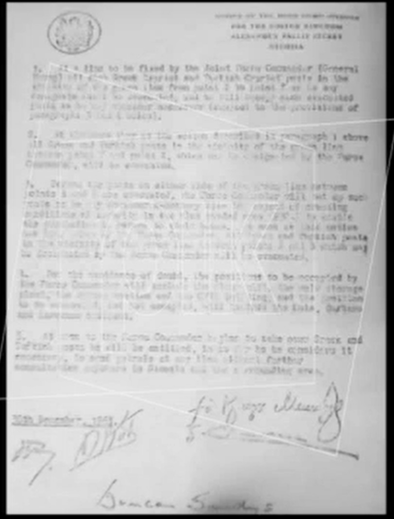 “Yeşil Hat”ı doğuran ilgili anlaşma, Atina ve Ankara ile istişare hâlinde, çatışmaların sona ermesini de beraberinde getirerek 30 Aralık 1963’te Lefkoşa’da Britanya Sömürgeler Bakanı Duncan Sandys, Kıbrıs Cumhuriyeti Cumhurbaşkanı Başpiskopos Makarios, Kıbrıs Cumhuriyeti Cumhurbaşkanı Yardımcısı Dr. Fazıl Küçük, Kıbrıs Temsilciler Meclisi Başkanı Glafkos Klerides ve Kıbrıs Türk Cemaat Meclisi Başkanı Rauf Denktaş tarafından imzalandı.