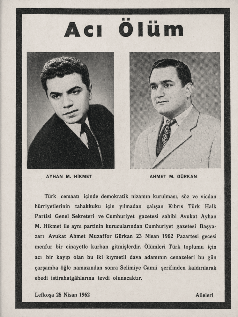 Lefkoşa’da, 1962 yılının 23 Nisan gecesi TMT tarafından vahşice katledilen Avukat Ayhan Hikmet ve Ahmet Muzaffer Gürkan, Kıbrıs Cumhuriyeti’nin yaşamasını destekleyen iki Kıbrıslıtürktü.