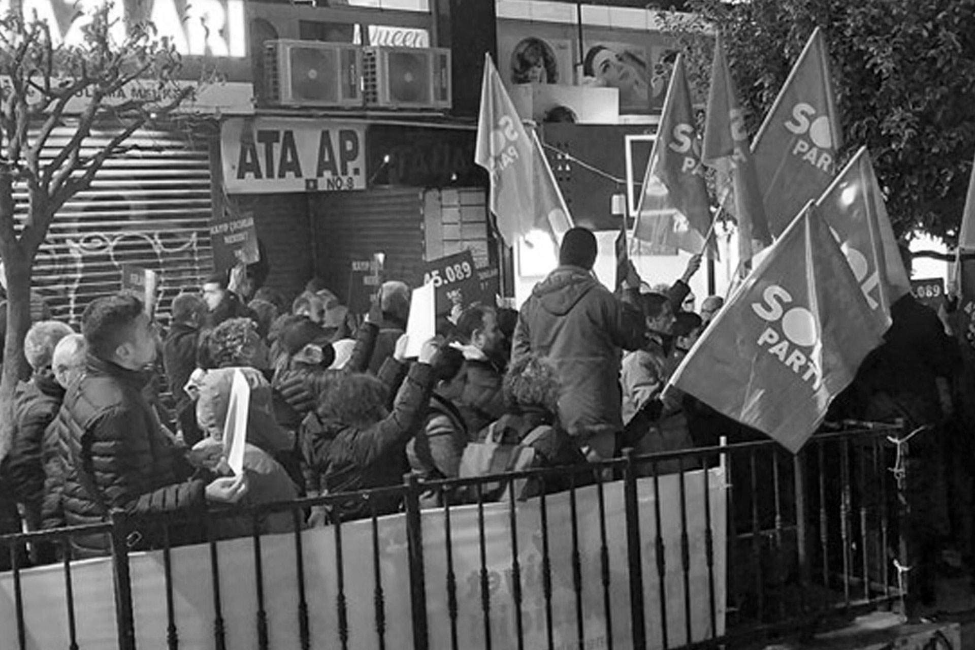 SOL Parti üyeleri, polis kuşatmasına karşın “Hükümet istifa” sloganlarıyla ilçe örgütünden çıktıkları sırada sarıldılar.