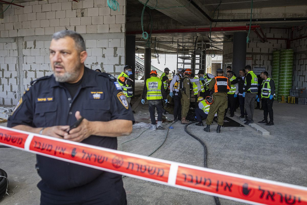 9 Mart 2026’da İran’dan atılan bir balistik füzenin şarapnel parçalarının düştüğü Yehud’daki olay yerinde bulunan İsrail kurtarma ve acil durum ekipleri. (Chaim Goldberg/Flash90)