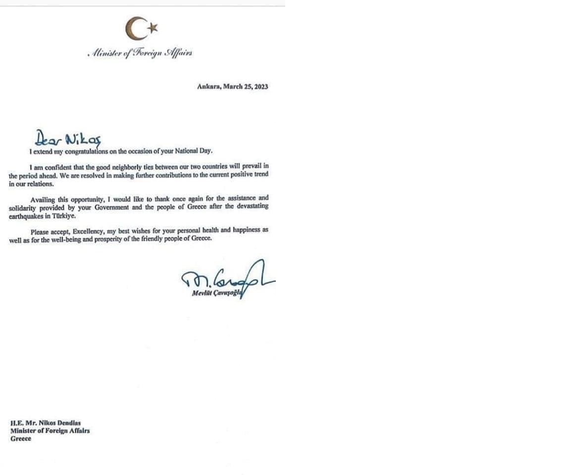 Türkiye Dış İşleri Bakanı Mevlüt Çavuşoğlu 25 Mart (Dün) Yunanistan’ın Bağımsızlık gününü kutlamak için Yunanistan Dış İşleri Bakanı Nikos Dendias’a tebrik mesajı gönderdi.