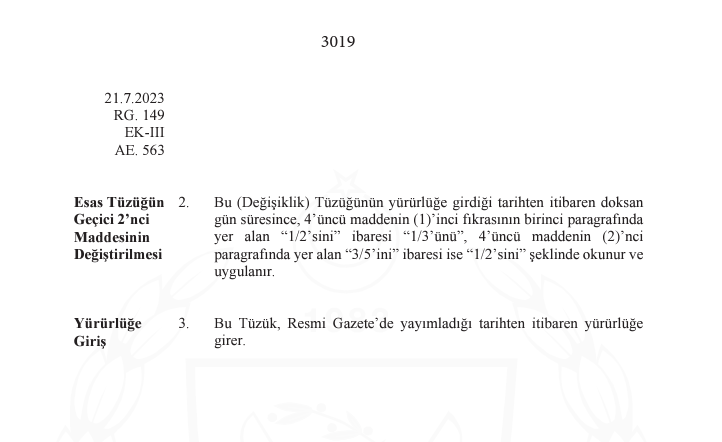 Bu (Değişiklik) Tüzüğünün yürürlüğe girdiği tarihten itibaren doksan gün süresince, 4’üncü maddenin (1)’inci fıkrasının birinci paragrafında yer alan “1/2’sini” ibaresi “1/3’ünü”, 4’üncü maddenin (2)’nci paragrafında yer alan “3/5’ini” ibaresi ise “1/2’sini” şeklinde okunur ve uygulanır.