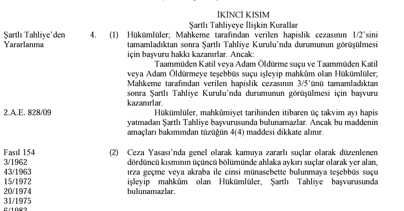 Resmi Gazete’de dün yayımlanan kararla, şartlı tahliye süreleri değiştirildi. Buna göre, cinayet hariç herhangi bir suçla cezaevinde bulunan kişiler cezalarının üçte birini tamamlamasının ardından şartlı tahliye hakkı verildi. Kararda, taammüden katil veya adam öldürme suçu ve taammüden katil veya adam öldürmeye teşebbüs suçu işleyip mahkûm olan Hükümlülerin ise ceza sürelerinin yarısını doldurmalarının ardından şartlı tahliyeye başvuru haklarının önü açıldı.